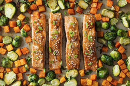 Sheet Pan Brussels Sprouts, Squash, and Salmon