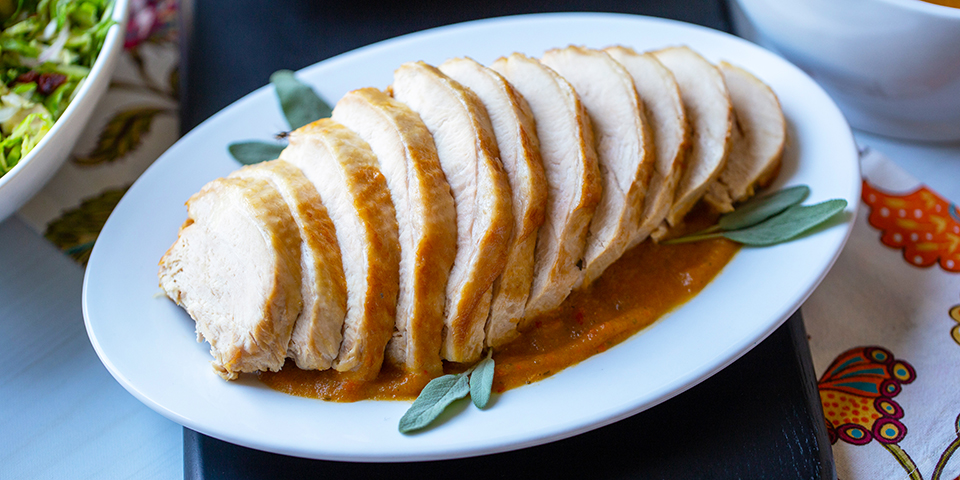 - Remove turkey breast to a carving board. Slice; remove bone. Set aside.